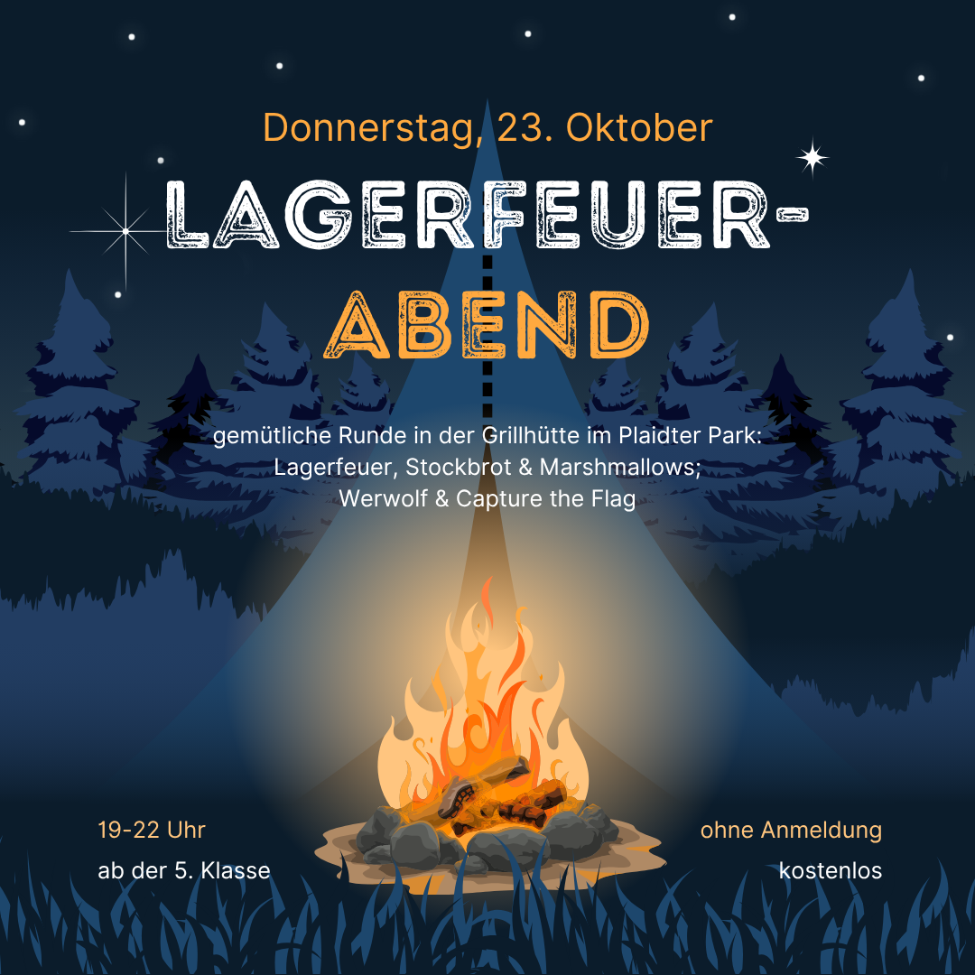 Am 23. Oktober öffnet das JUZ zunächst von 14.00-19.00 Uhr wie gewohnt, ab 19.00 Uhr sind wir in der Grillhütte (gegenüber dem JUZ) zum Lagerfeuer-Abend.