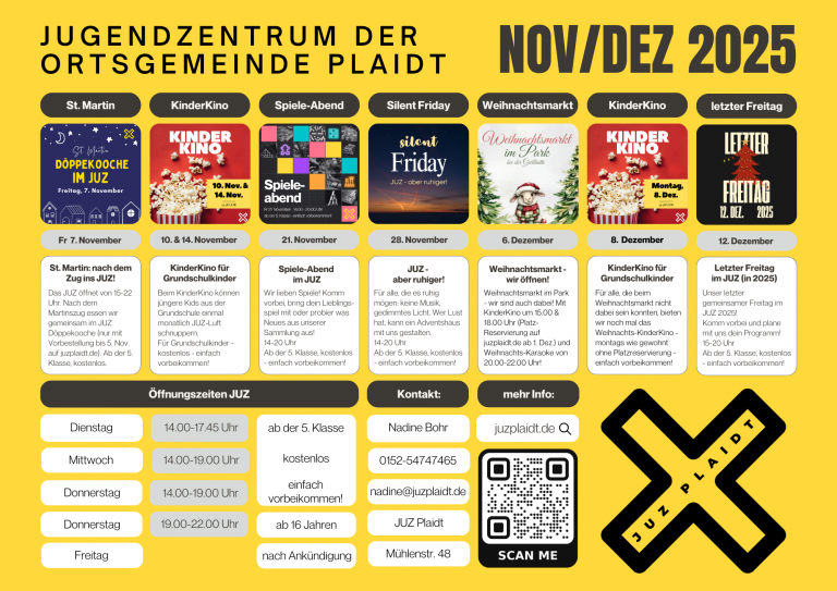 Ruhe statt Trubel – Jugendzentrum Plaidt lädt zum „Silent Friday“ ein Am Freitag, den 28. November 2025, findet im Jugendzentrum der Ortsgemeinde Plaidt von 14:00 bis 20:00 Uhr erneut der „Silent