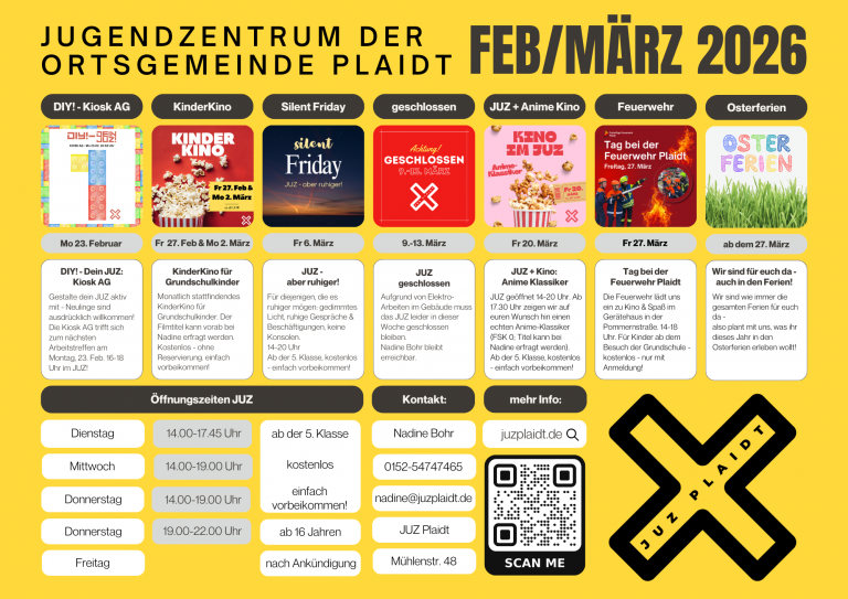 An Karneval (Mittwoch, 11. Februar bis Veilchendienstag, 17. Februar) bleibt das JUZ Plaidt geschlossen. Das JUZ wird am Mittwoch, den 18. Februar & Donnerstag, den