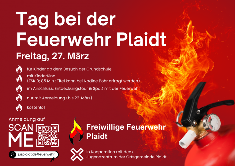 Zum Start in die Osterferien lädt die Freiwillige Feuerwehr Plaidt in Kooperation mit dem JUZ Plaidt Kinder zu einem spannenden Nachmittag rund um das Thema Feuerwehr ein.