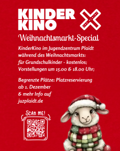 Anlässlich des Weihnachtsmarktes an der Grillhütte in unmittelbarer Nähe zum Jugendzentrum bieten wir am Samstag, den 6. Dezember einen KinderKino – Special an. Das JUZ öffnet um 14.00 Uhr, um jeweils um 15.00 und um 18.00 Uhr zeigen wir im KinderKino einen Weihnachtsfilm. Teilnehmen können Grundschulkinder. Der Eintritt ist kostenlos.