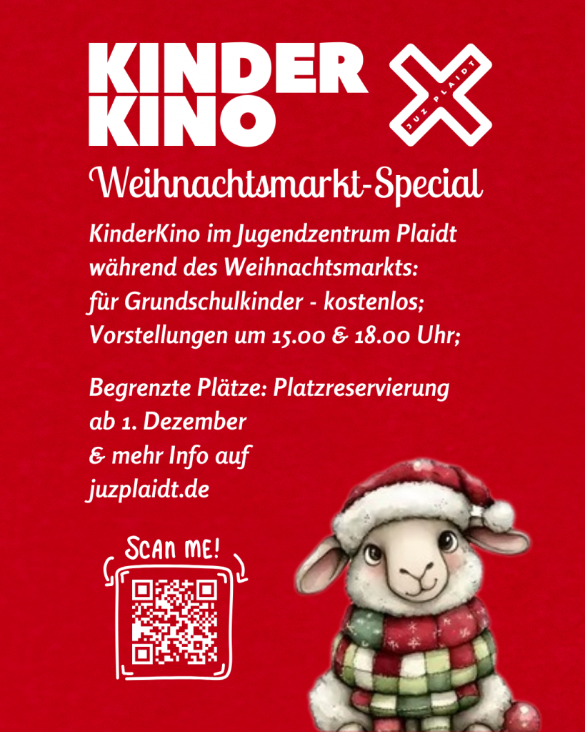 Am Samstag, den 6. Dezember 2025, lädt das Jugendzentrum der Ortsgemeinde Plaidt Kinder und Jugendlichen zu einem abwechslungsreichen Programm ein. Anlass ist der Weihnachtsmarkt rund um die Grillhütte im Plaidter Park, der sich in unmittelbarer Nähe zum Jugendzentrum befindet. Passend dazu findet das monatliche Kinderkino im Dezember am Tag des Weihnachtsmarktes statt – ergänzt durch ein stimmungsvolles Abendangebot.