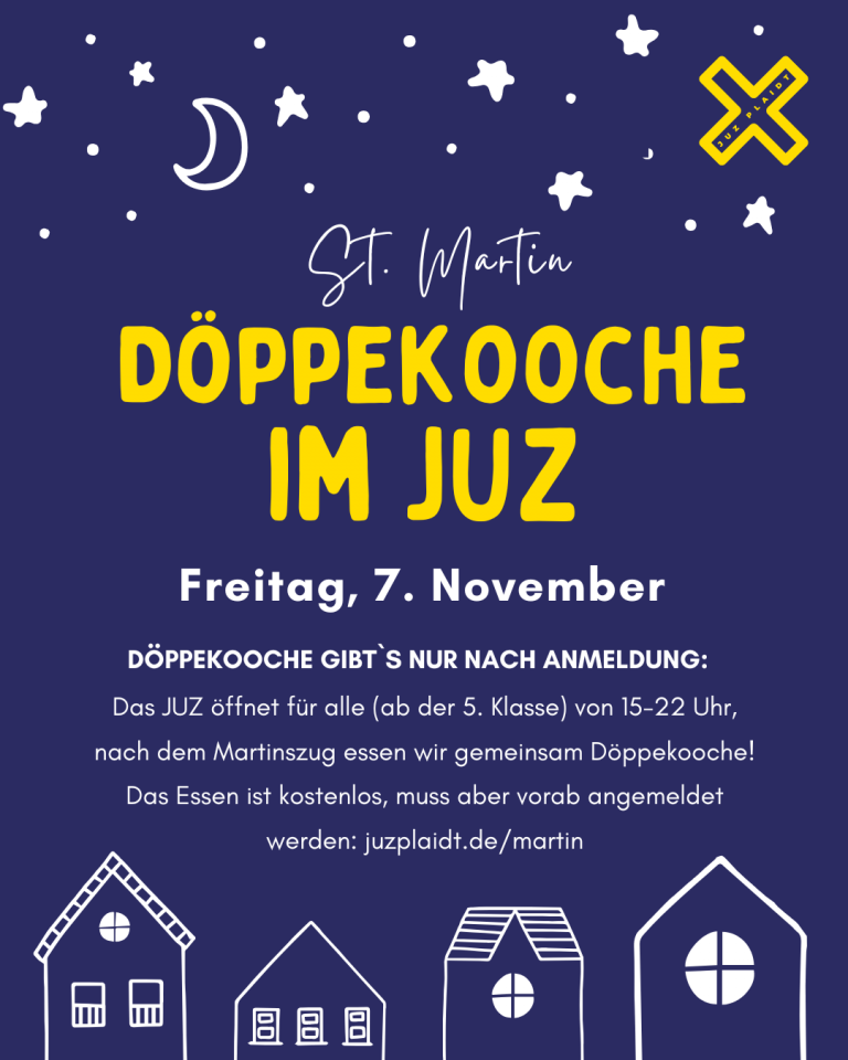 Es gibt die Möglichkeit nach dem Martinszug gemeinsam in gemütlicher Runde Döppekooche mit Apfelmus im JUZ zu essen, die Ortsgemeinde lädt euch hierzu ein.